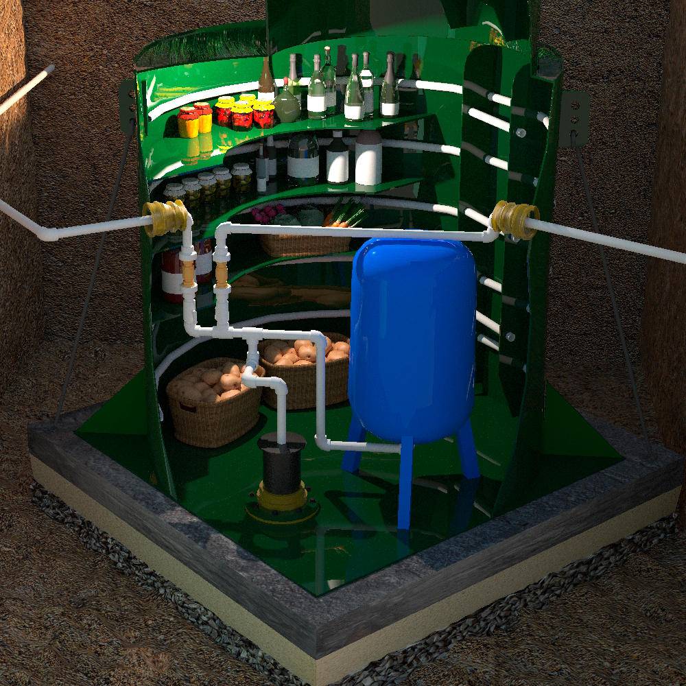 Тёплый свет, отражаясь от стен, рассеивается по всему внутреннему пространству пластикового погреба, освещая даже нижние полки.
